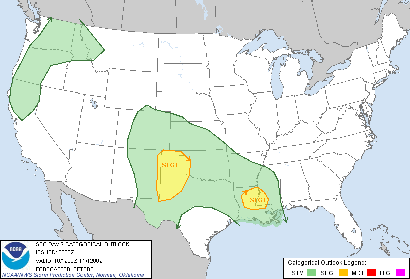 The severe weather outlooks for Tuesday through Saturday are shown below. The severe weather threat for each day is within the color coded area described below each image: