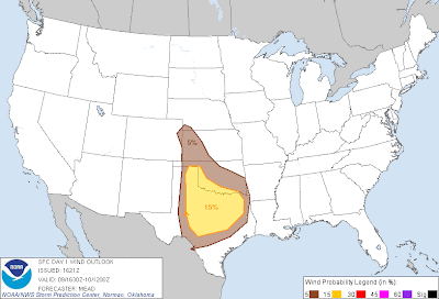 Overnight tonight, a threat for more widespread thunderstorm development will exist across central and eastern portions of the outlook area, as upper level energy increases and the surface dryline and a Pacific cold front move East/Southeast across the region.